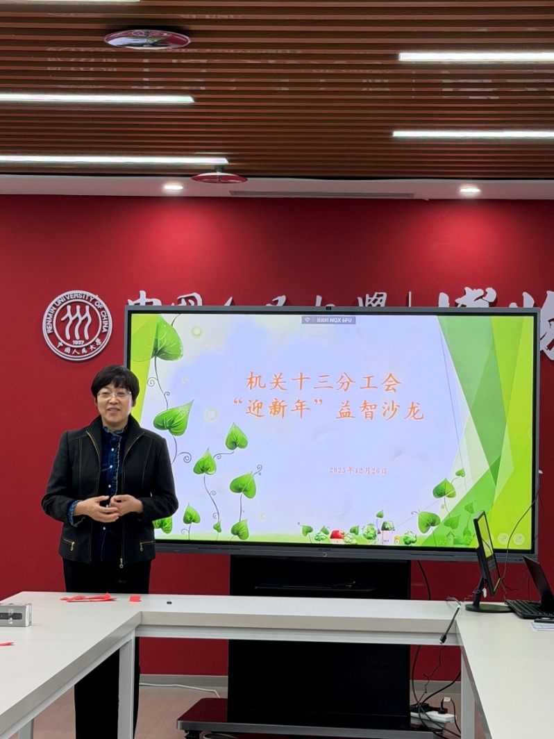 发布时间:2026-01-06点击:为丰富教职工精神文化生活,营造温馨和谐、团结奋进的团队氛围,迎接新年的到来,机关十三分工会于2025年12月26日中午在博物馆209会议室精心组织了一场别开生面的“迎新年”益智沙龙活动。活动在轻松愉悦、笑声阵阵的氛围中进行,分工会教职工欢聚一堂,共度了一段充满智慧与温情的时光。